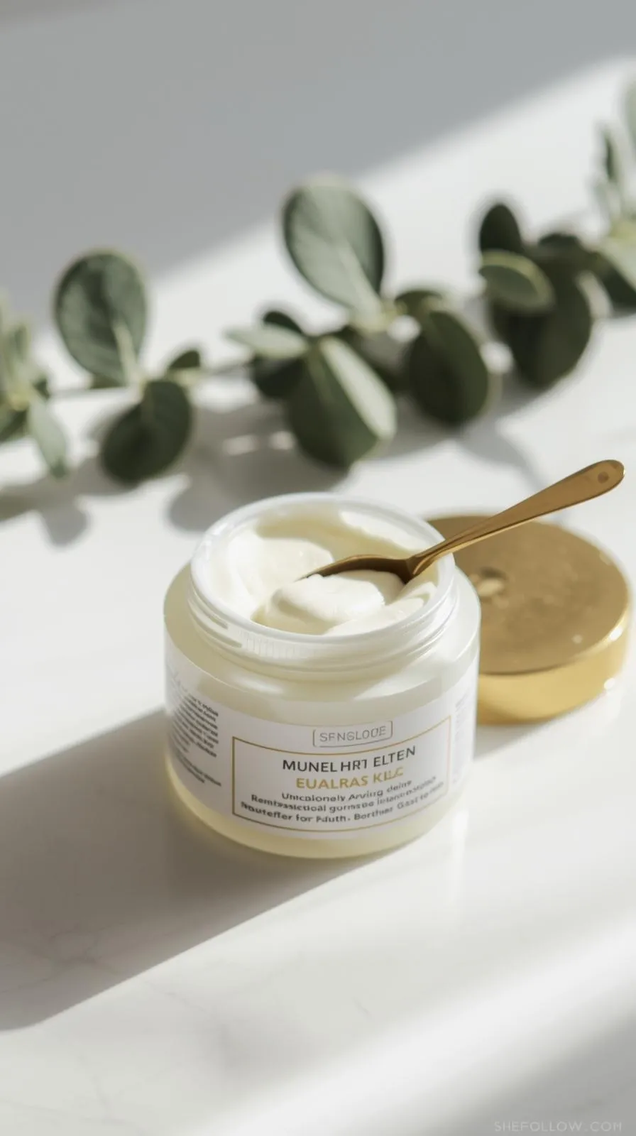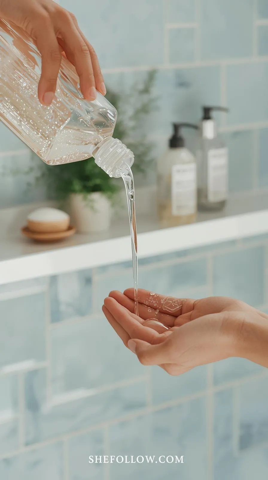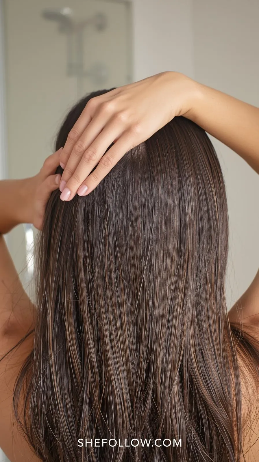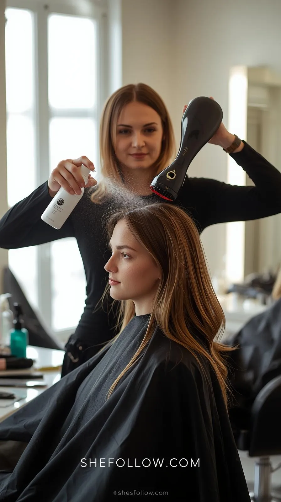 Vertical 9:16 — model misting hair with heat protectant before curling — bright natural bedroom vanity light — soft minimal décor — no text — website bottom center: SheFollow.com.