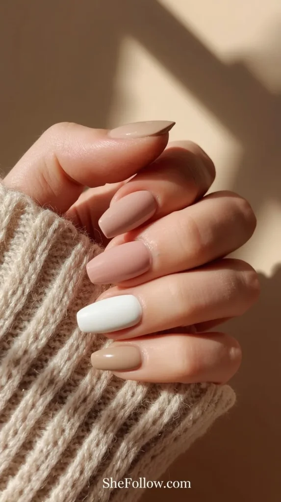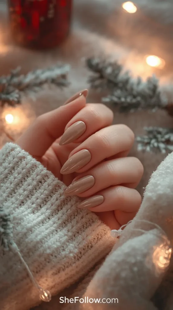One of the strongest Christmas nail trends 2026 is the rise of cozy, winter-inspired neutrals. Think soft latte, warm beige, oat milk, mushroom gray, and creamy ivory — shades that feel like wrapping your hands around a hot drink on a cold December morning.
