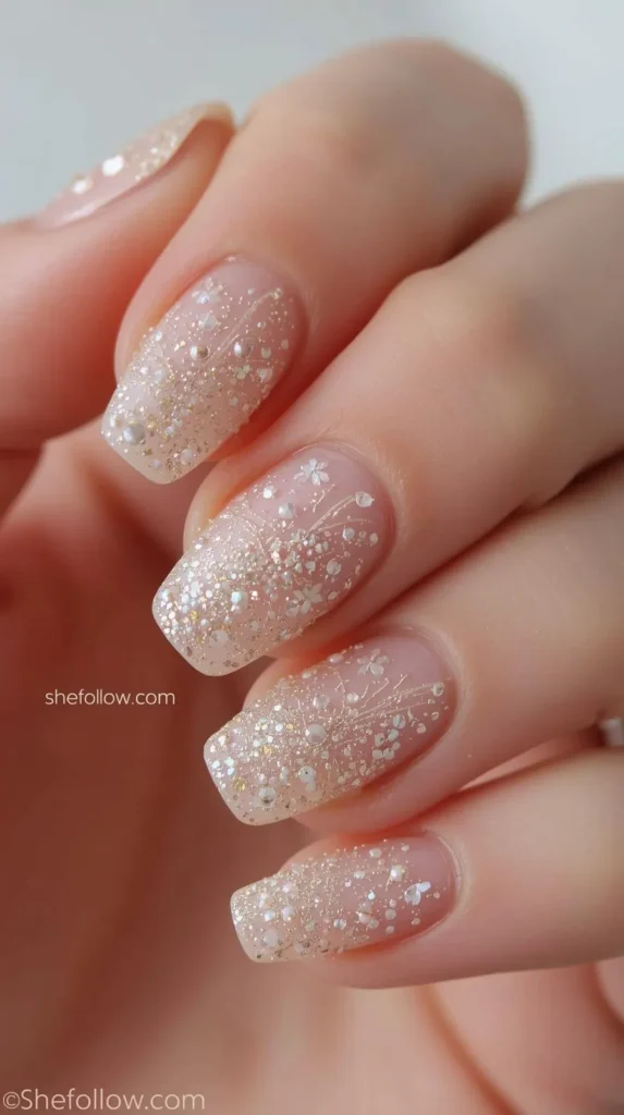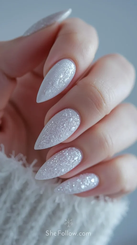 Champagne, icy silver, soft gold, and sheer rose shimmer are especially popular. These nails catch the light beautifully while remaining wearable for daytime and evening, making them ideal for holiday events and winter weddings.