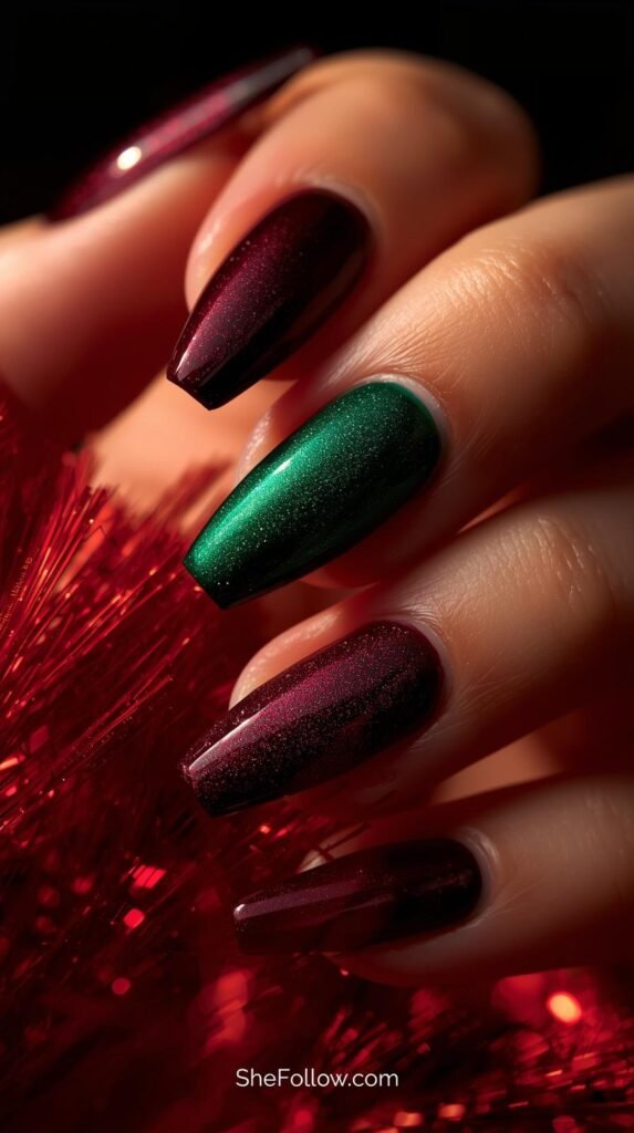 Velvet nails continue to rise, becoming one of the most eye-catching Christmas nail trends 2026. Using magnetic cat-eye polish, these nails create a soft, plush glow that shifts with the light — perfect for candlelit dinners and holiday parties.