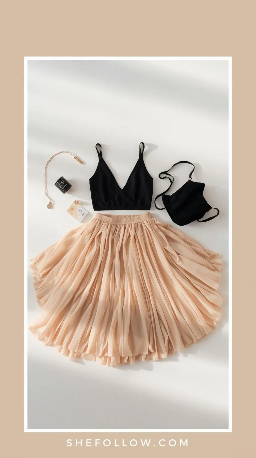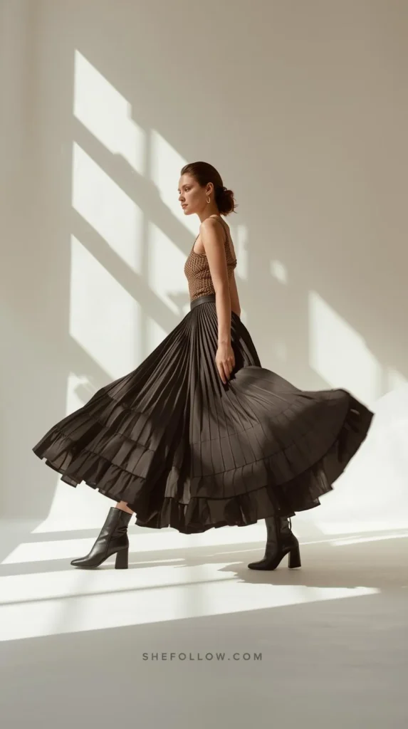 Add a belt to highlight the waist, or opt for clean lines to keep the focus on the movement of the skirt.